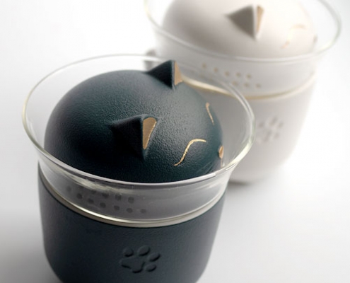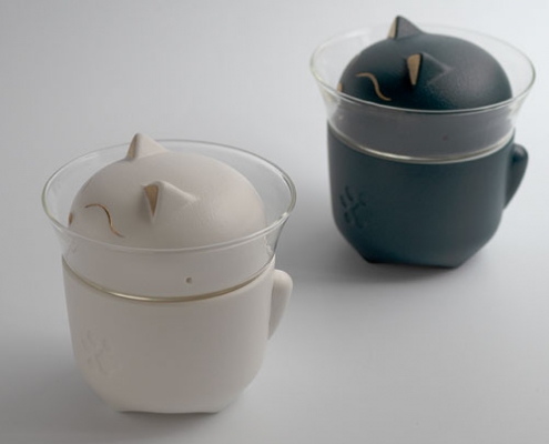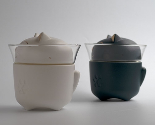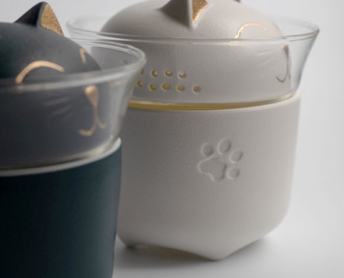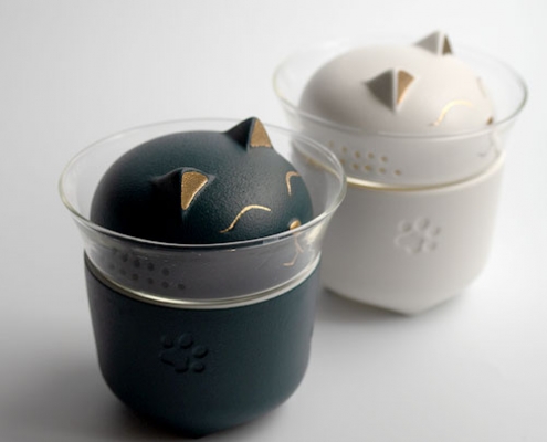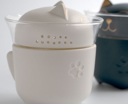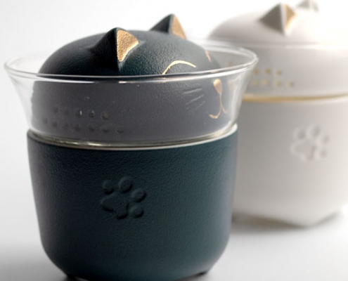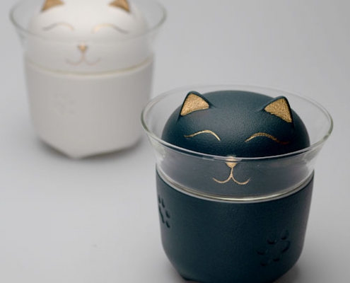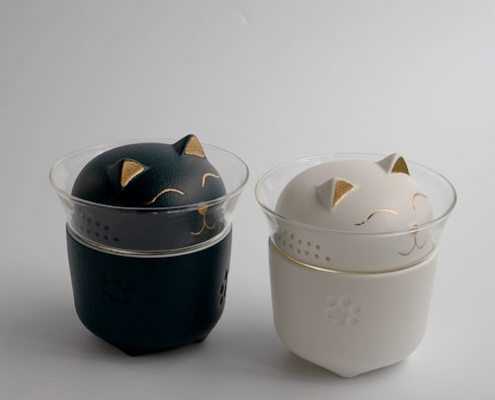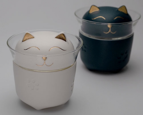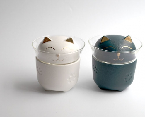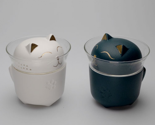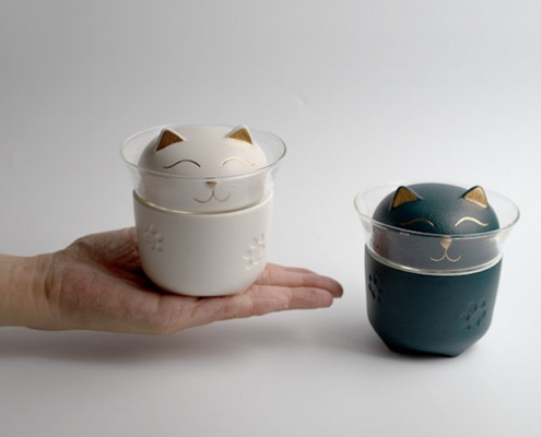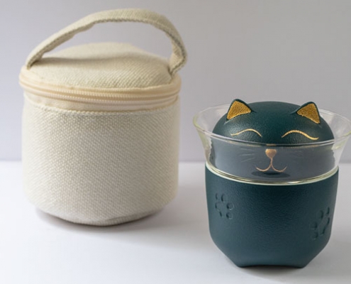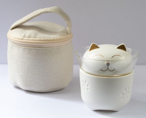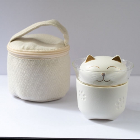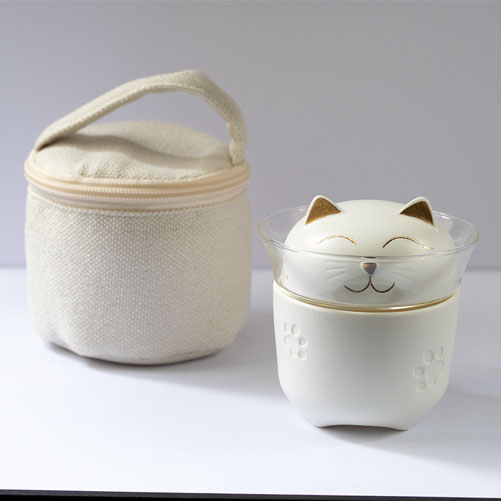 JP:「幸福猫」シリーズ 茶器三点セット(白) 収納ポーチとティーマット付き