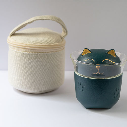 JP:「幸福猫」シリーズ 茶器三点セット(紺) 収納ポーチとティーマット付き